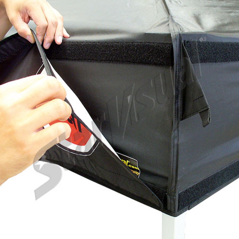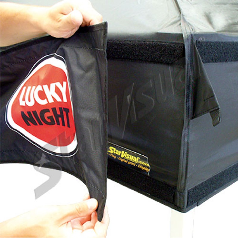 - tramite il velcro cucito sia sulla mantovana che sullo striscione - permette la flessibilità di cambiare la pubblicità secondo le esigenze senza cambiare il tetto che in questo modo rimane sempre neutro.